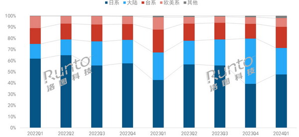 聚焦到商用領(lǐng)域,根據(jù)洛圖科技(RUNTO)數(shù)據(jù)顯示,在中國(guó)傳統(tǒng)商用投影市場(chǎng)中,日系品牌的份額從2022年初的59.9%降至2024年第一季度的47.7%;而以光峰、索諾克為代表的國(guó)產(chǎn)品牌市場(chǎng)份額則從2022年初的17.5%上漲至2024年第一季度的23.6%。