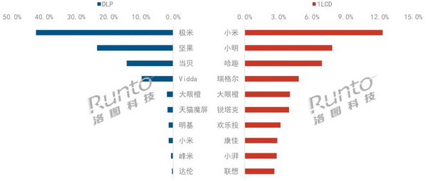 DLP市場品牌格局已經穩定,并且呈極高寡占型。根據洛圖科技(RUNTO)線上監測數據顯示,2024年上半年,線上市場的銷量和銷額維度下排名前四的品牌均為極米、堅果、當貝和Vidda,合計銷量份額達到86.6%,集中度(CR4)同比上漲了1.8個百分點;合計銷額份額達到90.3%,同比上漲3.2個百分點。