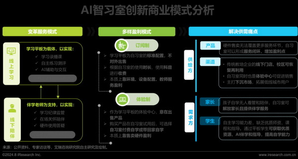通過線上的平板自學,線下的伴學服務,AI智習室變革了傳統線下教培的服務模式,本質上是用平板替代老師,用自習室、伴學服務營造閉環服務,以打造更加高效、低成本、合規的商業模式。在訂閱制收費模式下,學習平板廠商是自習室主體的上游,不直接作為盈利項,而是成為整個AI智習室的核心部分。AI智習室根據學生的使用時長和科目,收取會員或訂閱費盈利。在體驗制收費模式下,自習室既可作為體驗中心,促進平板銷售,也可作為學習中心,支持學生購買產品后的試用和長期訂閱服務。這樣靈活高效的模式,可以解決供需雙方不同的痛點。對供給方而言,產品方面可以形成服務閉環,增加盈利點,渠道方面可以充分利用線下門店和校區,以及發揮體驗中心的優勢,同時也有助于拓展下沉市場。對需求方而言,可解放家長且提供伴學服務,也可為學生提供優質資源、AI伴學服務和指導,以提高其自學能力。但行業仍需注意該模式的長期合規性,以及以平板代替老師的有效性和技術倫理問題。