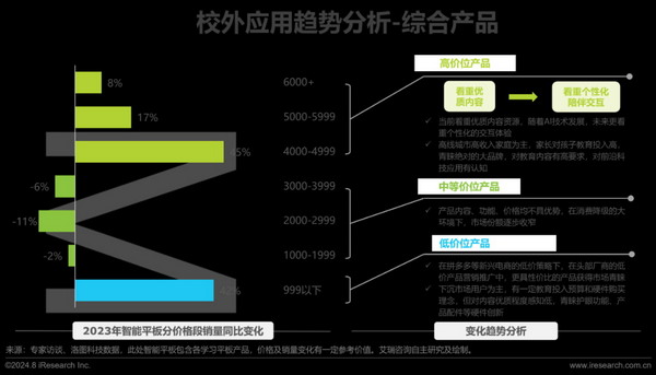 當前校外的綜合功能產品以學習平板一類獨大。從應用趨勢來看,未來學習平板市場可能呈M型發展,高、低價位產品持續起量,中等價位產品市場收窄。對高價位產品而言,當前獨家優質內容已形成差異化競爭力,隨著AI技術的發展,未來用戶可能更看重個性化、陪伴性的交互體驗。這類產品以高線城市高收入家庭為主,家長對孩子教育投入高,青睞絕對的大品牌,對教育內容有高要求,對前沿科技應用有認知。對低價位產品而言,在新興電商的低價策略、頭部廠商的低價產品推廣中,低價產品勢頭強勁。這類產品以下沉市場用戶為主,他們有著一定教育投入預算和硬件購買理念,但對內容優質程度感知低,青睞護眼功能、產品配件等硬件創新。而中等價位產品由于內容、功能、價格均不具鮮明優勢,在消費降級的大環境下,市場份額逐步收窄。