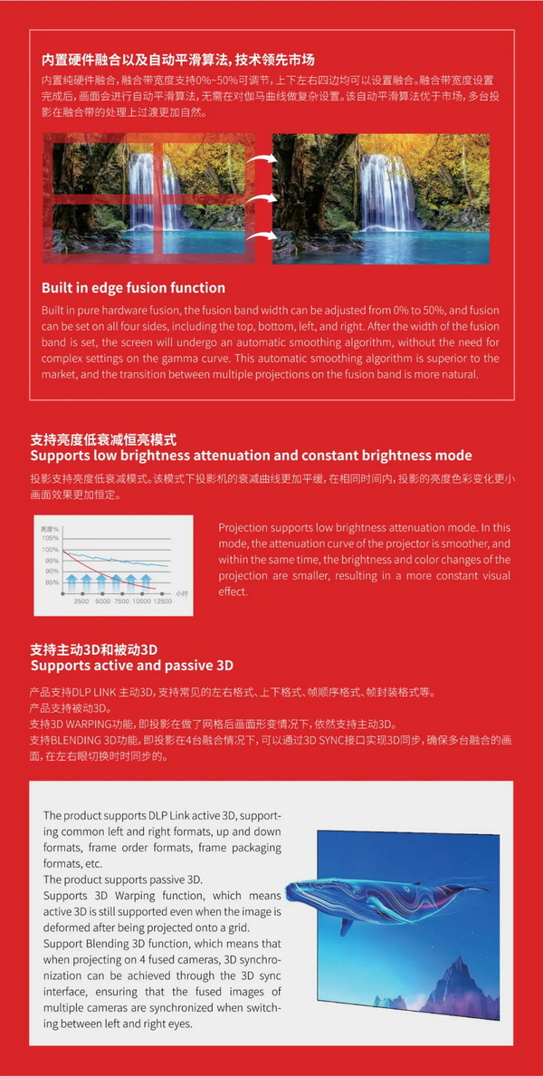 DU21K定位于專業工程投影,采用了更穩定的光機架構設計和遠心光學架構設計,使得投影畫面在色彩均勻度和亮度均勻度方面表現出色。其中心亮度高達21000流明,即使在戶外復雜的光照環境下,也能呈現出清晰、穩定的投影效果。這一特性對于玄武湖水幕投影秀來說至關重要,因為它需要確保在廣闊的湖面上形成足夠亮度和清晰度的畫面,以吸引游客并帶來震撼的視覺效果。
