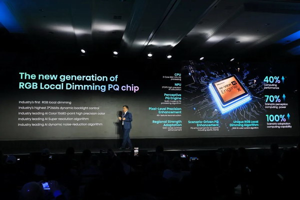 海信作為國內(nèi)最早研發(fā)畫質(zhì)芯片的電視廠商,在面對RGB Mini LED背光這個芯片難題之際,的確展現(xiàn)了自己強(qiáng)大的芯片研發(fā)能力。這次海信的RGB Mini LED電視搭載有海信自主研發(fā)的全新一代信芯AI畫質(zhì)芯片,而這也是全球首顆RGB光色同控畫質(zhì)芯片,從我們實際了解的情況來看,這顆芯片在CPU部分采用了三核心的RiSC架構(gòu),硬件算力的CPU單核性能提升40%,感知場景計算能力提升 70%,同時擁有最高3×26bit的動態(tài)背光控制能力,而且在控光部分采用了RGB背光和液晶面板雙重控光架構(gòu),無論是功能還是性能,都完美匹配了RGB-LED的Mini LED背光。