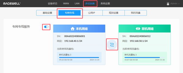 4、筆記本電腦打開網頁,輸入聚合路由器A的IP地址,登錄WebUI,在“多徑加速-專網專線”處,可以看到2臺聚合路由器已經聯機,搭建了專網專線。