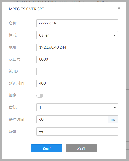 8、登錄解碼器A的WebUI,在“數據源”頁簽中,點擊“添加”,選擇MPEG-TS over SRT在彈出的頁面中,模式選擇“Caller”,地址填寫為編碼器A的IP地址:192.168.40.244,端口號填寫8000。延遲時間改為400。點擊“確認”。