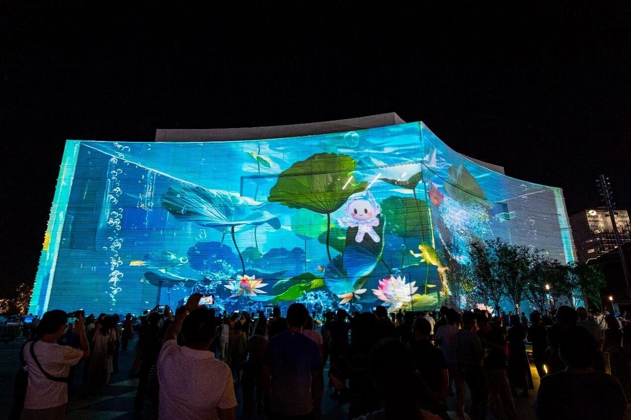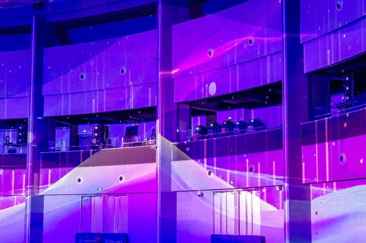 主會場西岸大劇院的光影秀位于劇院建筑的北側墻體,總長86米,高度23.45米。劇院有著獨特的外觀造型,外立面采用凸起的直線型線條詮釋“水岸漣漪”概念,北面墻體整體還呈夾角結構,這都為投影增加了難度。投影工程師們精心設計投影機安裝位置與光路,確保觀眾可以在現場的多個角度都能隨時觀看到精彩的影像。