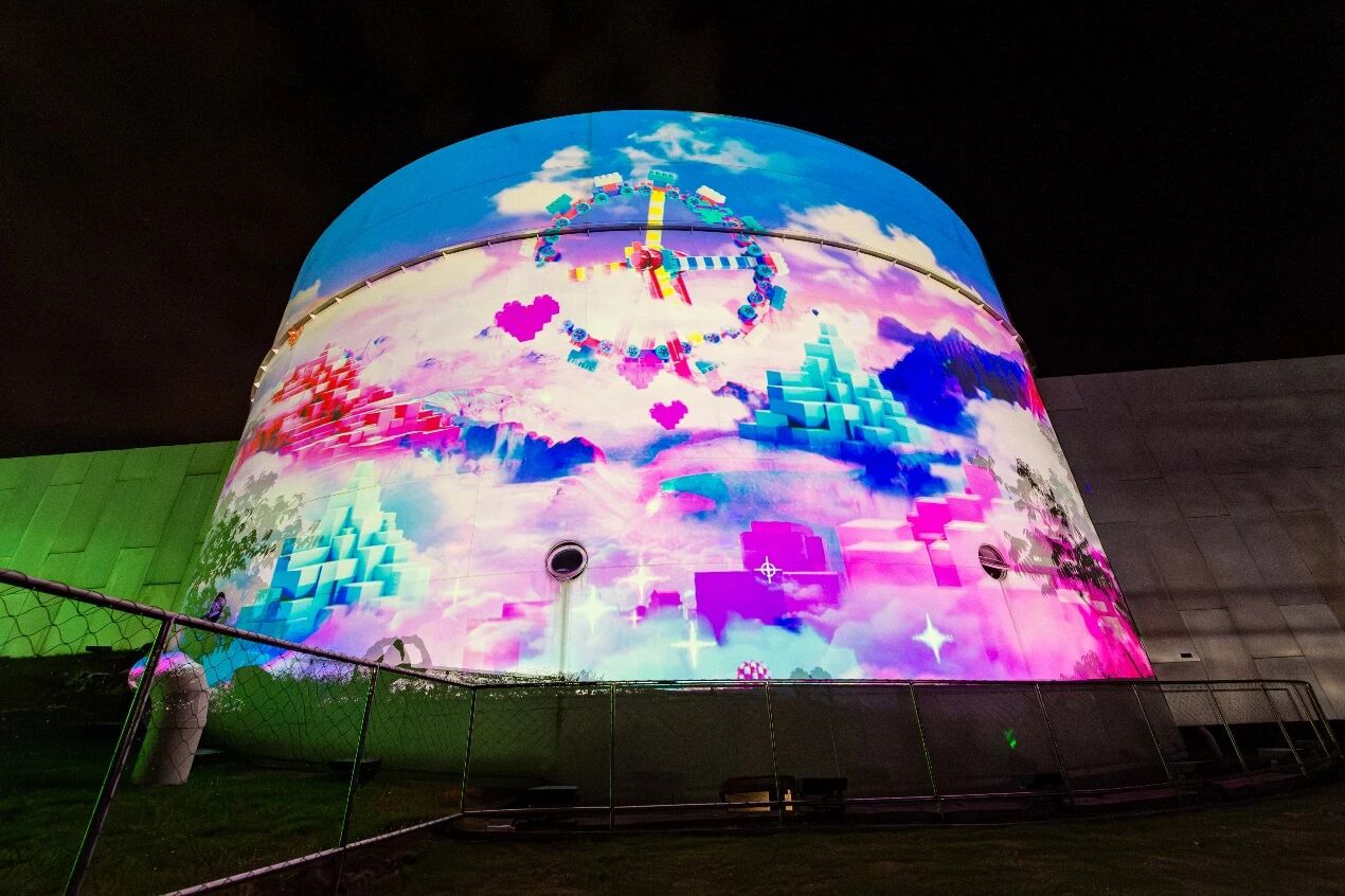 油罐藝術中心作為曾經城市工業歷史的遺存,在光影節期間也披上了光影的外衣。其中的5號罐,與穹頂藝術中心和西岸大劇院的投影秀遙相輝映。在它們之間的廣場上,“東方有吉市”光影市集為光影節更添熱鬧。5號油罐和罐體上生動的光影,成為了市集的背景。讓觀眾在欣賞光影的同時,也可以邊玩邊逛,在光影節度過美好一晚。