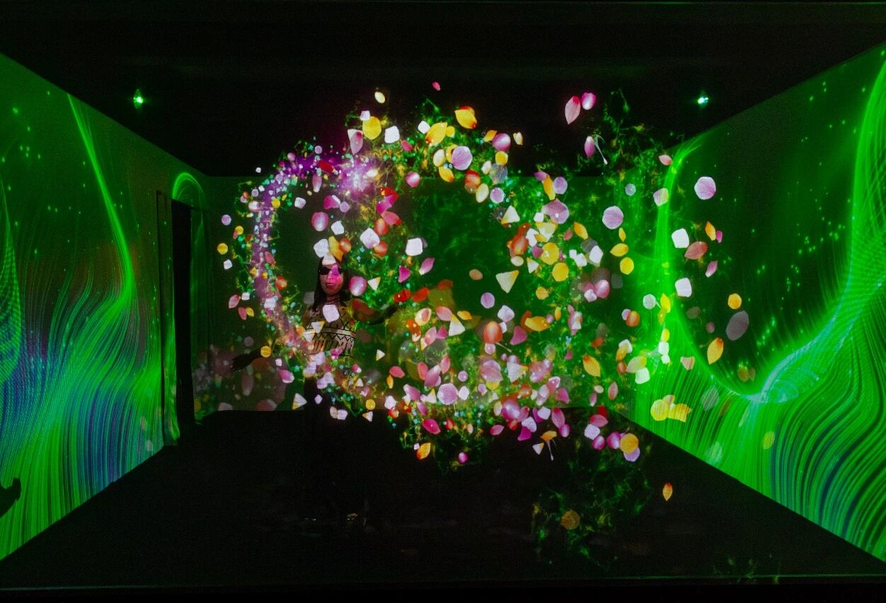 其中的《舞影隨行》展項使用全息舞臺投影、體感高速追蹤兩種技術,創造出靈動奇幻的氛圍。真人與光影同臺演出,影像與人的動作無延遲互動,不停律動變幻,虛實疊加,既有寫實,也有寫意,盡顯藝術與科技融合的魅力。松下獨有的高速實時追蹤投影技術,是實現人與光影實時互動的關鍵。配合高速追蹤投影,還構建了沉浸式CAVE空間,使人置身于光影之中,讓人直接成為塑造光影故事的核心要素,營造“人動光隨”的創意體驗。