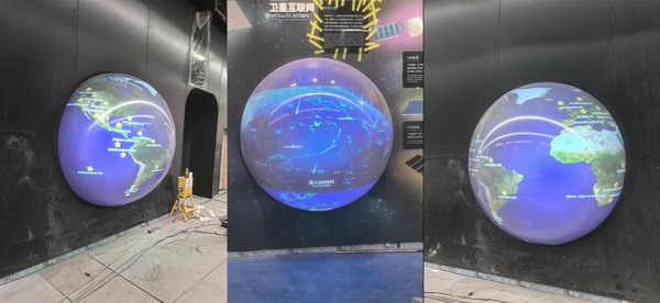 深圳市數緯視訊科技有限公司憑借其專注于球形顯示、地理天文科普科教領域優勢,特別是針對博物館科技館的定制專業片源內容和硬件軟件的融合能力,其多種球幕展示方式用于展館各個展廳,分別有天花板吊裝、隱藏式掛壁、落地安裝等方式,在3樓展廳掛壁安裝半球配置了觸摸互動功能,參觀者可以提供觸摸互動轉動地球、彈屏播放、放大縮小拖動等,更好增加體驗感。