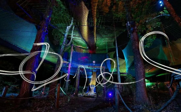 全球標(biāo)桿游樂景區(qū)——Uplå蹦床公園,依托自然森林場域和大型高空網(wǎng)狀結(jié)構(gòu),創(chuàng)新性地推出夜間沉浸式體驗項目 “Uplå Aglow”,打破蹦床運(yùn)動的固有玩法,轉(zhuǎn)化為兼具娛樂、社交、藝術(shù)與潮流美學(xué)的數(shù)字文旅新場景。