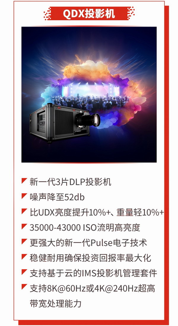 QDX系列是新一代三片DLP激光投影機,亮度提升10%,重量輕10%,亮度高達35000-43000 ISO流明,同時噪聲降至52db,支持8K@60Hz或4K@240Hz超高帶寬處理能力,更強大的新一代Pulse電子技術,滿足客戶對圖像質量和色彩還原的更高需求。