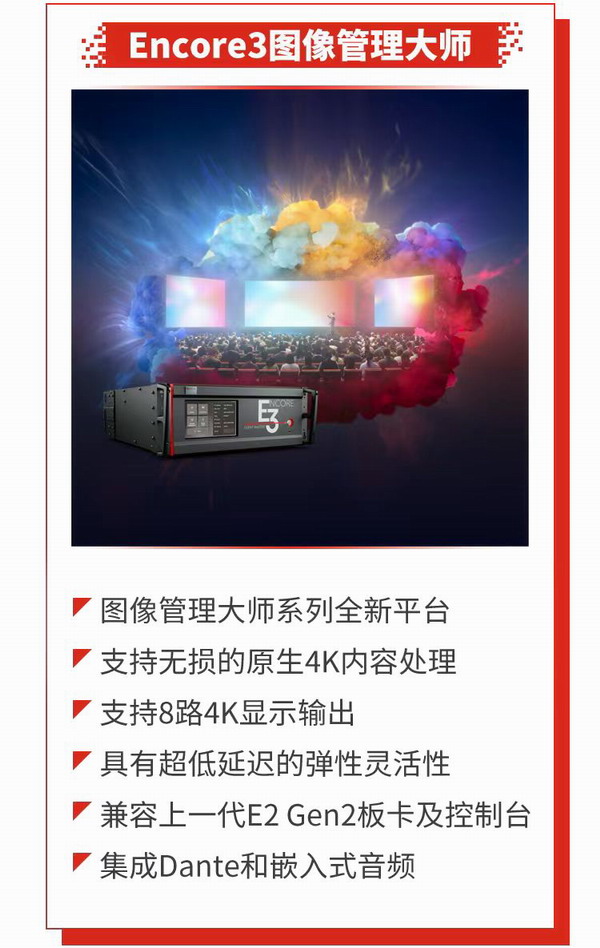Encore3是圖像管理大師系列全新平臺,更為先進可靠,輸出帶寬比上一代產品E2提升一倍,支持8路4K顯示輸出,信號延遲更低,功能更強大且穩定。同時,Encore3兼容上一代E2 Gen2板卡及控制臺,集成Dante和嵌入式音頻,客戶在升級換代時可節省投資成本