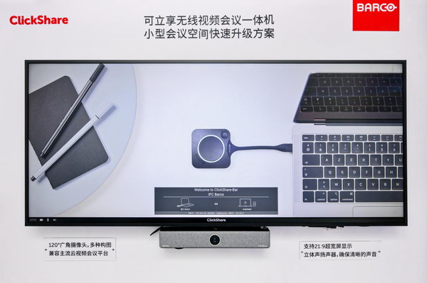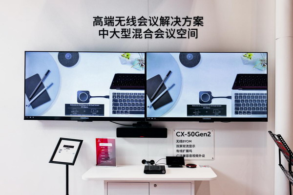 在本屆展會上首秀的可立享無線會議屏,憑借一體化設計真正實現化繁為簡,通過專業音視頻技術實現高效溝通,無線BYOM使用更便捷,再加上靈活的擴展與穩健的品質,成為高端音視頻會議室的理想選擇。