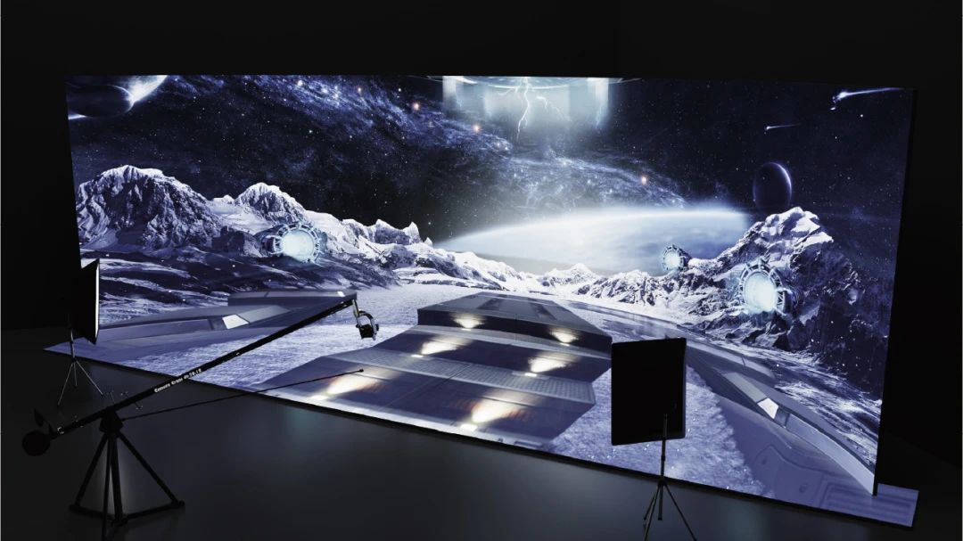 此規模性質的影棚適合于拍攝影視等。采用的LED顯示屏通常有立屏、天幕屏等,同時,地面通常會布置實景。