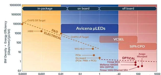 在D2D光互連與硅光子CPO應用中,μ - LEDs與硅光子芯片緊密結合,提供高頻寬、低功耗的光學互連方案,有效提升了數據中心的數據吞吐量。結合波分多工(WDM)技術,μ - LEDs能夠支援多通道并行傳輸,進一步增強傳輸容量,為下一代通訊提供了高效的解決方案。