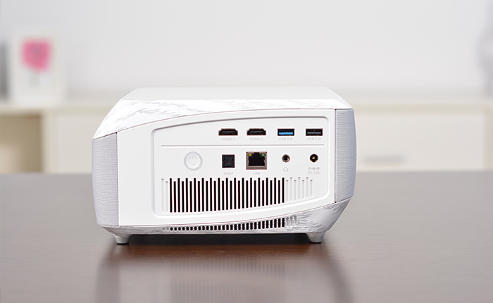 神畫F1智能影院體積有21cm×20cm×11cm,雖在小巧上,在市場優勢不大,但無論是放在茶幾還是放在床頭柜上都恰到好處,并且其機身采用特殊材質,體積雖不小,卻也不笨重。同時,F1機身采用了非對稱的流線型設計,加上高級灰與白色的色調搭配,時尚又簡約,非常符合時下現代消費群體的審美。此外,本次神畫F1機身選用不含重金屬材料,其外殼則為ABS+PC的注塑材料,不僅可降解、無毒無害、環保,還可以阻燃,在外形上已經如此精道,也證明了神畫對每一款產品的獨到用心。