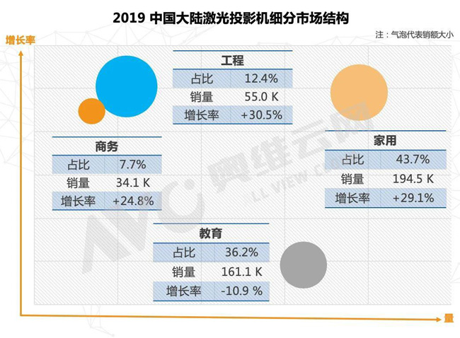 2019年以來,投影行業細分市場格局進一步調整,其中家用市場和激光為代表的固態光源產品的崛起,成為了行業核心亮點。據行業數據顯示:2019年中國激光投影市場出貨量444.7 K臺,同比增長10.9%,銷售額11682 M元,同比增長11.7%。(不包含激光放映機)。可以說產業的變革,影響了市場增速,但變革中也創造了新的結構性市場機遇。
